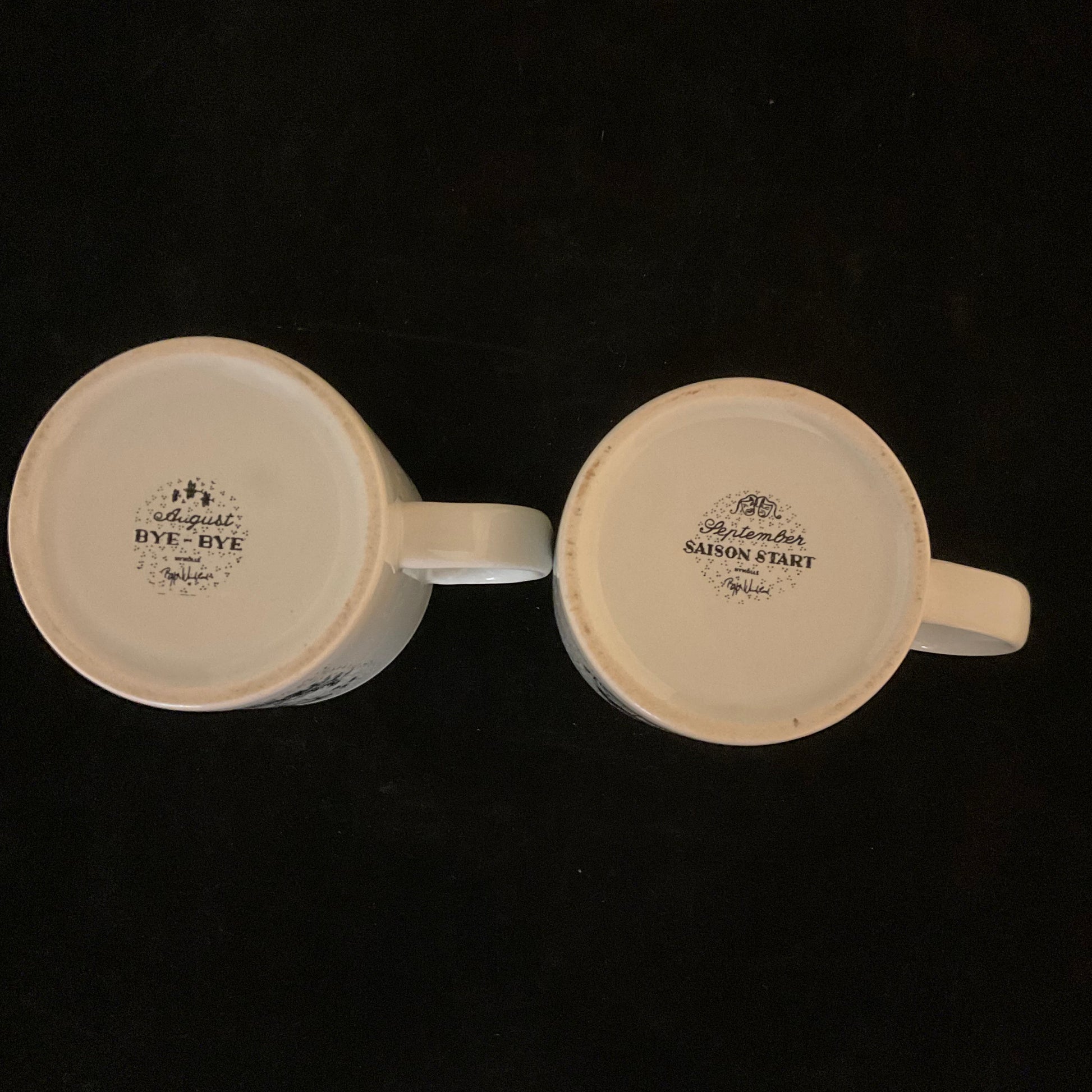 Her August “Bye-Bye” og September “Saison Start” i porcelæn/fajance, med de typiske prikmønstre og fantasifulde figurer, som kendetegner Wiinblads univers.