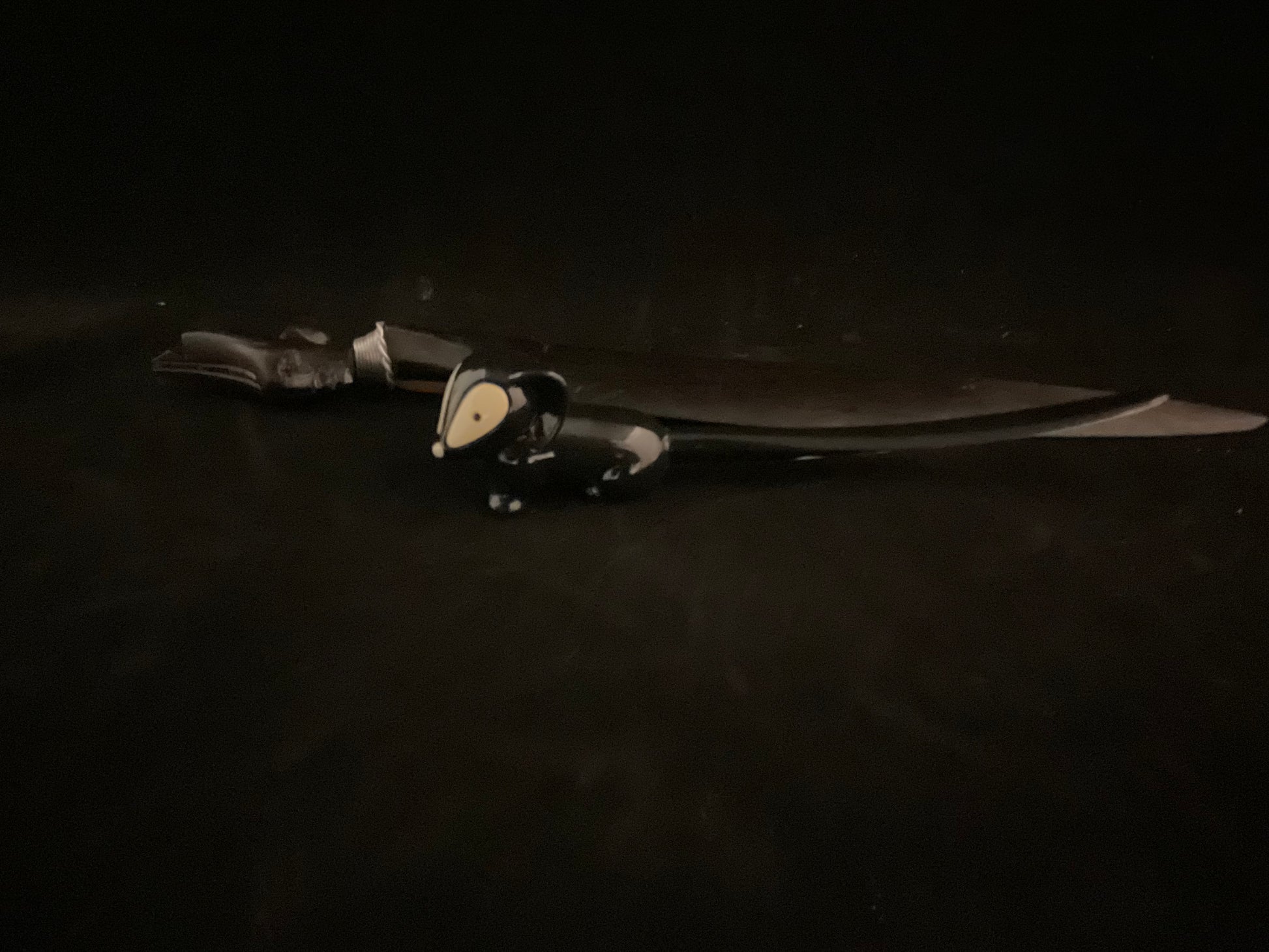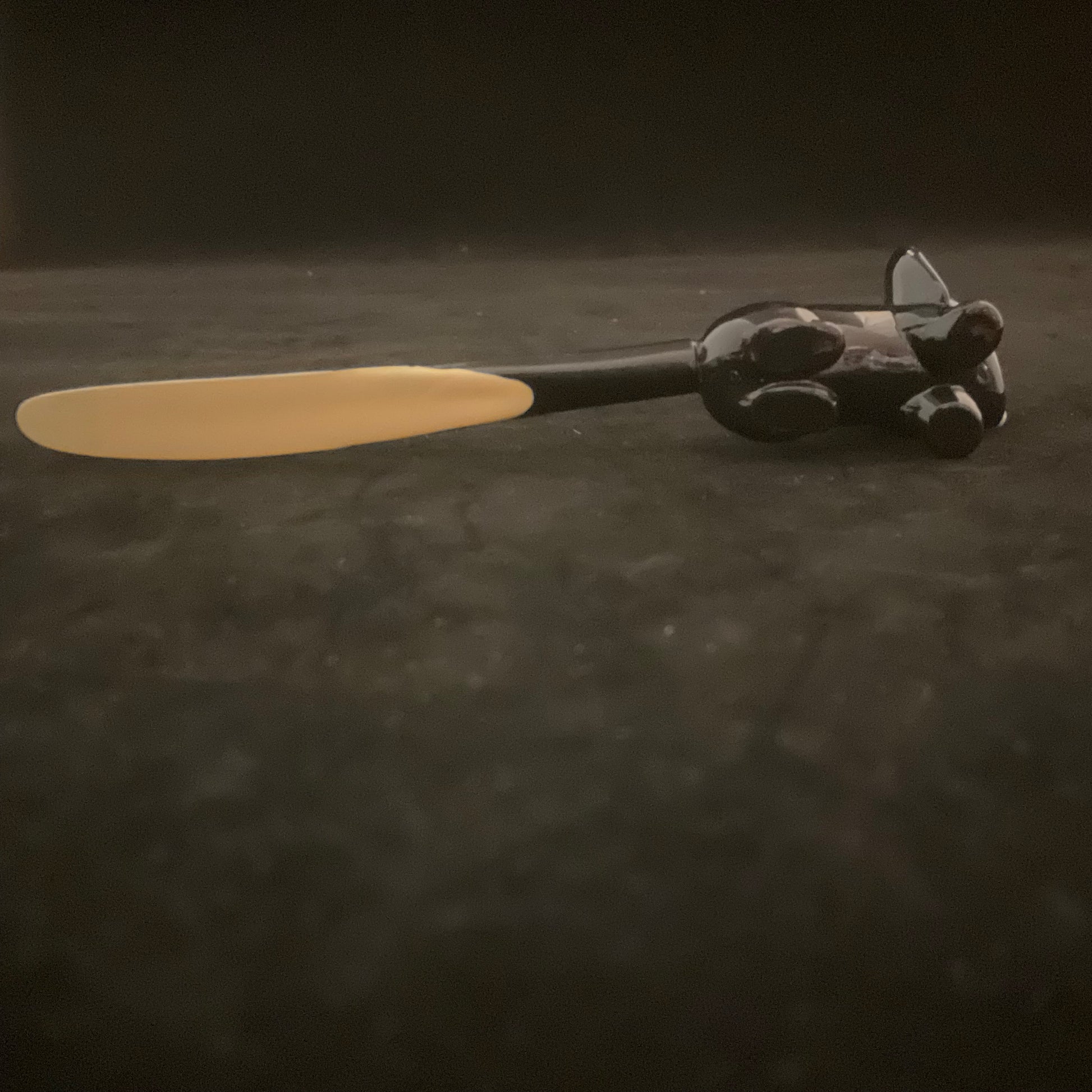 • Den mindre (ca. 14 cm) er formet som et dyr – formentlig ræv eller grævling – i mørklagt eller bakelit og med lyse detaljer.