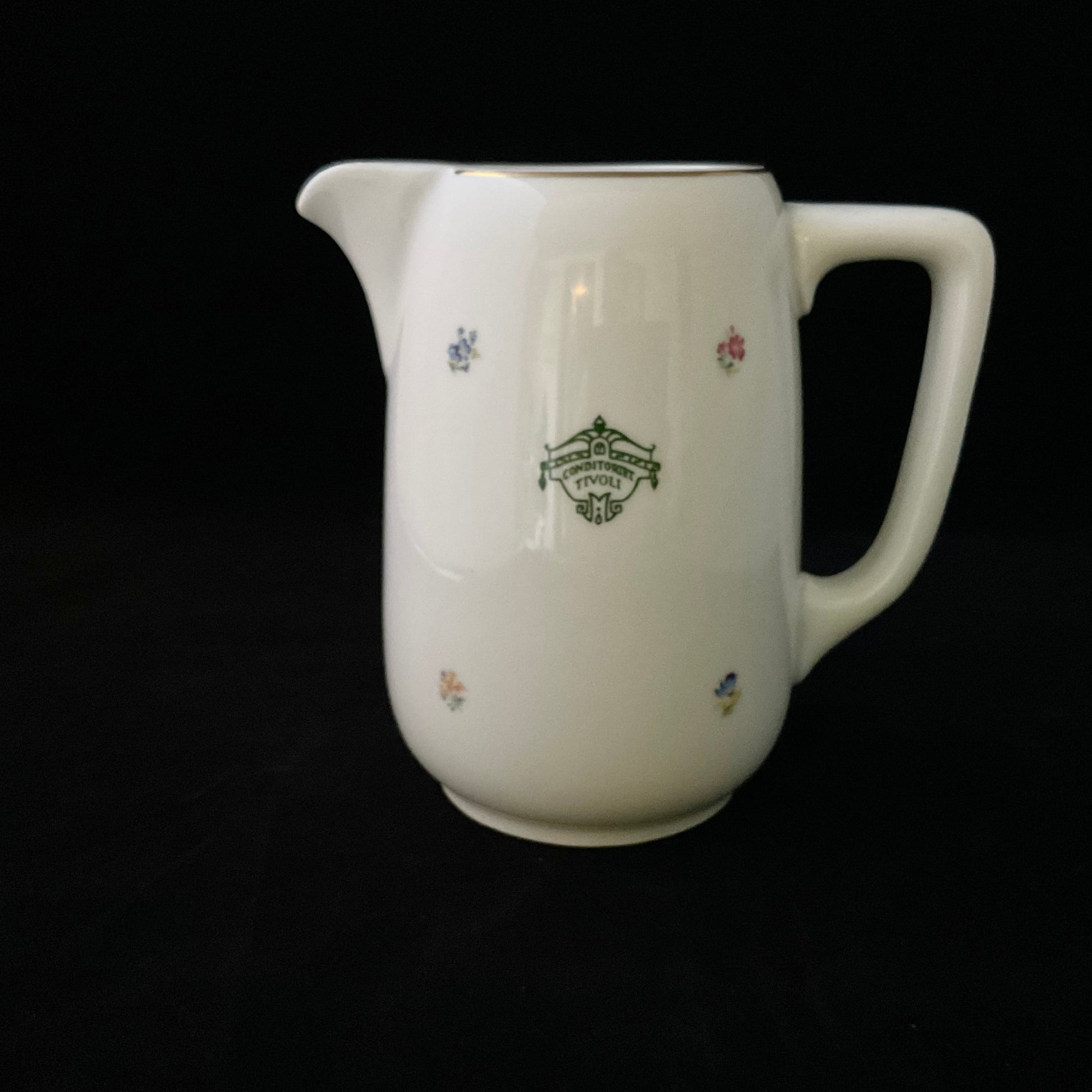 Porcelænskande, dekoreret med små blomster og grønt Conditoriet Tivoli-logo.