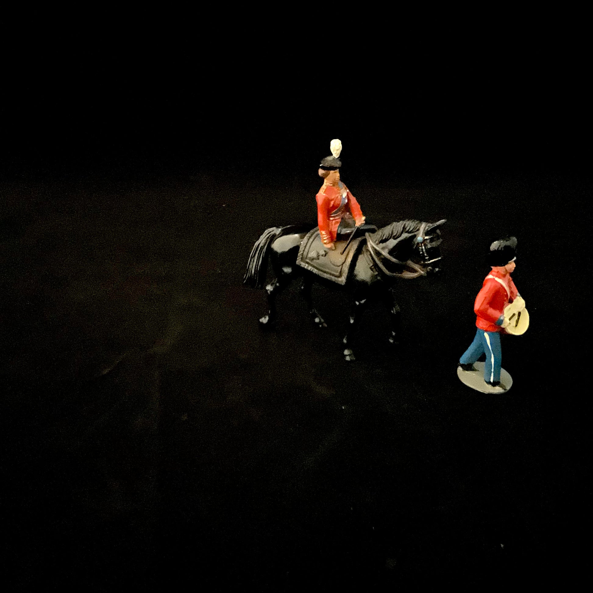 Figurer, muligvis fremstillet for W. Britains. Figuren med dronningen til hest kan tages af hesten, og er i metal. Trommeslageren sansynligvis af lineol.