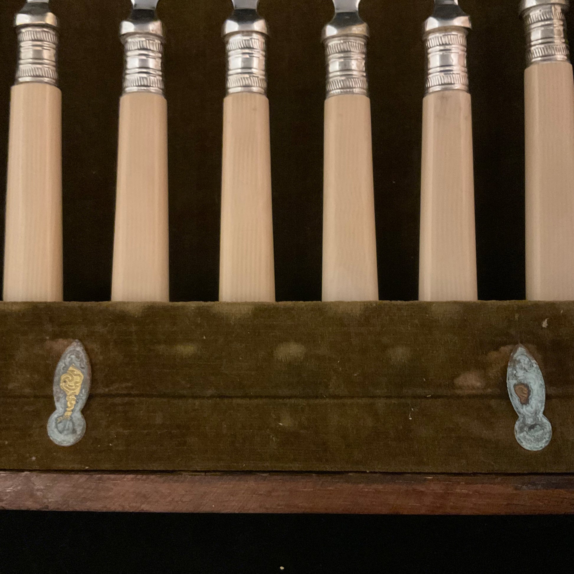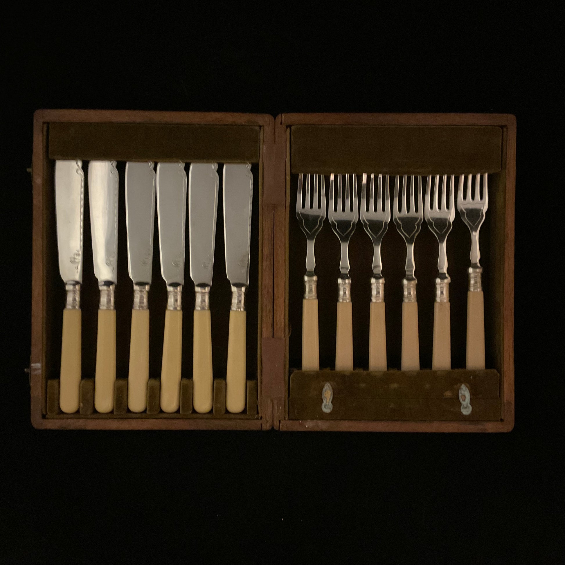 Indeholder 6 knive og 6 gafler i en Original trææske med messingbeslag og grønbrun fløjlindlæg.