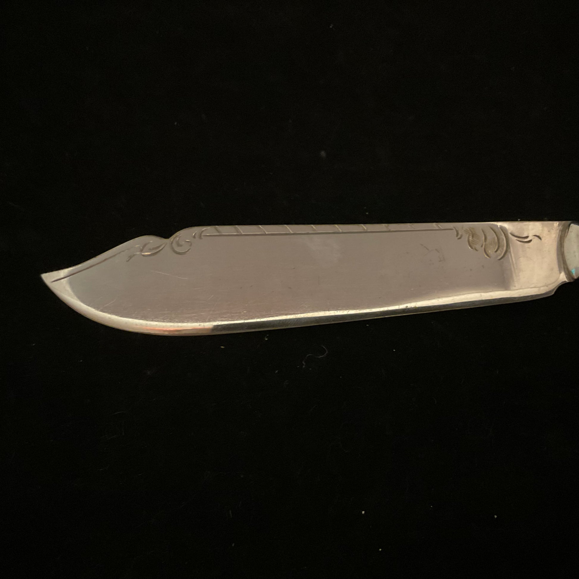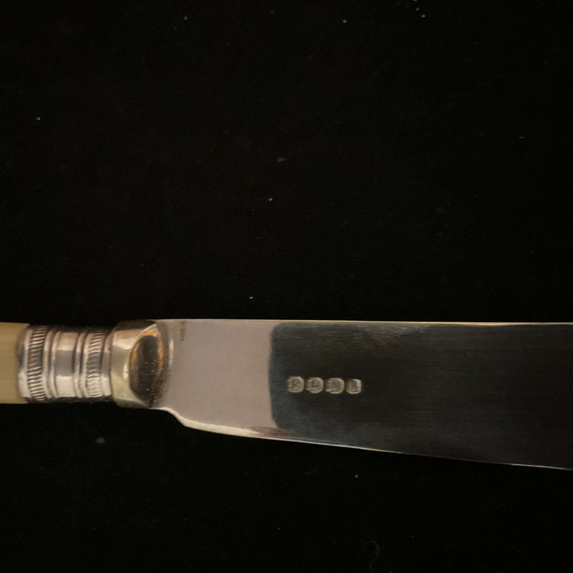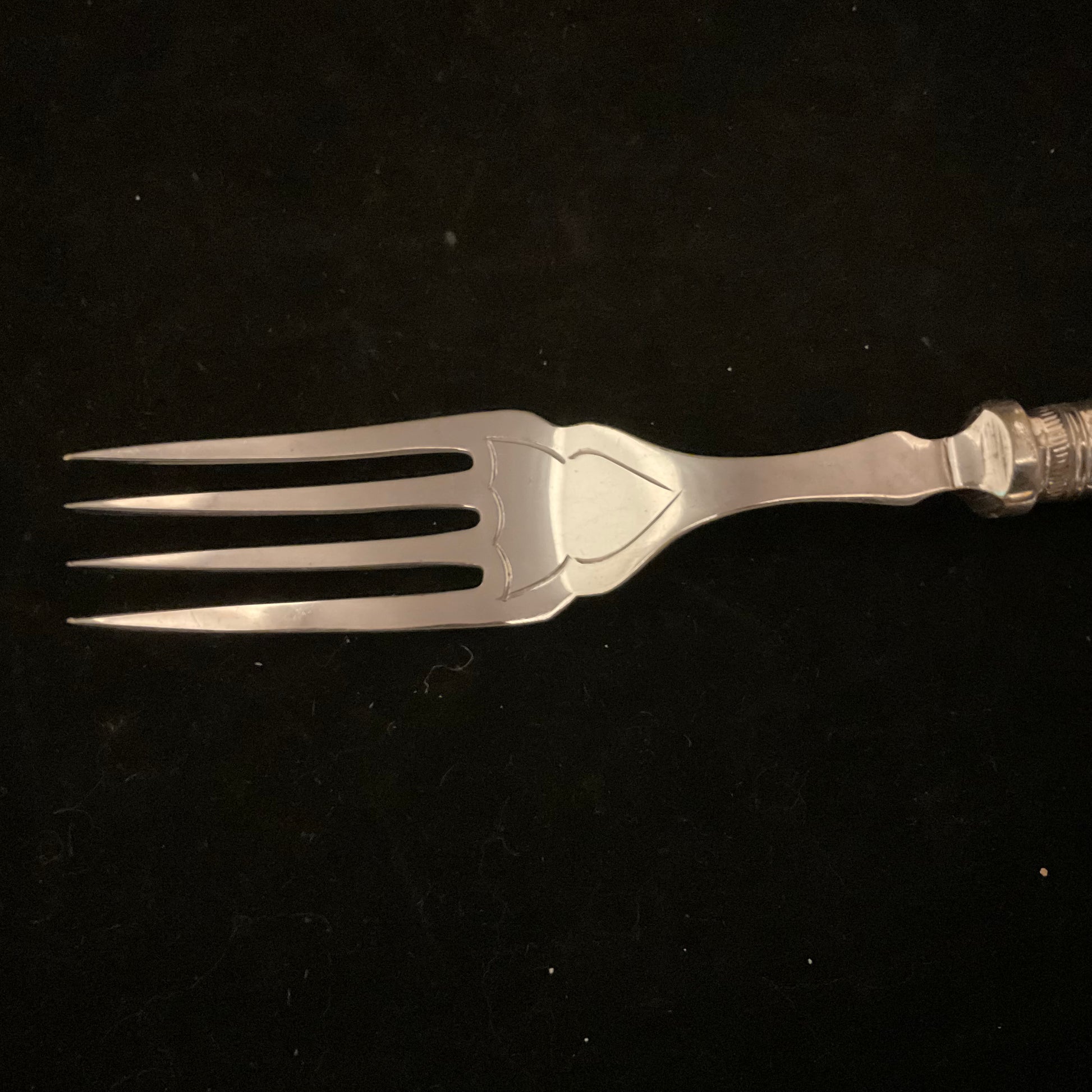 Sættet har klassiske celluloidgreb i cremefarvet tone og fine, graverede detaljer på blad og gaffel – typisk for 1940–50’ernes britiske bordkultur.