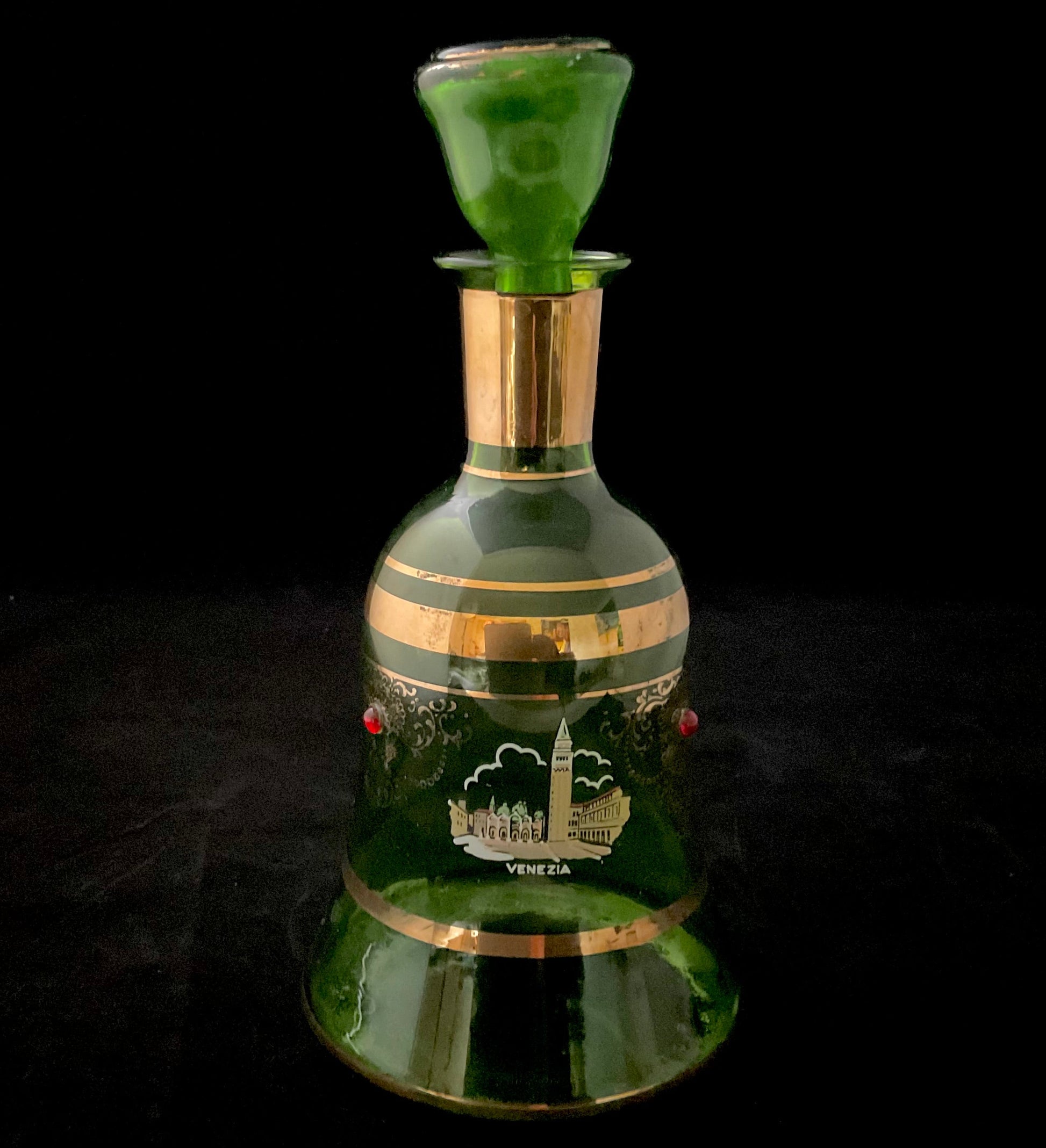 Farverig karaffel i grønfarvet glas med kobberfarvede bånd og silhuetmotiv af Venedigs kirker og kanaler. Dekoreret med klassiske gondoler og Santa Maria della Salute.