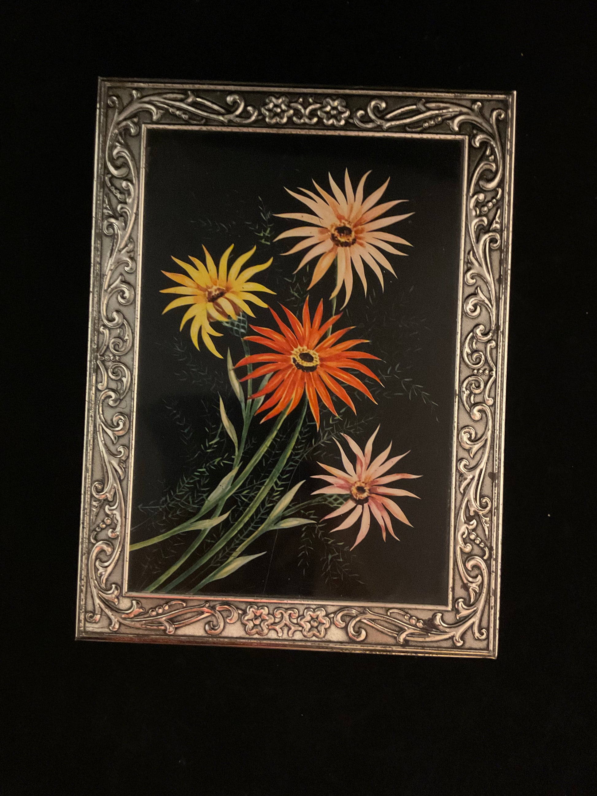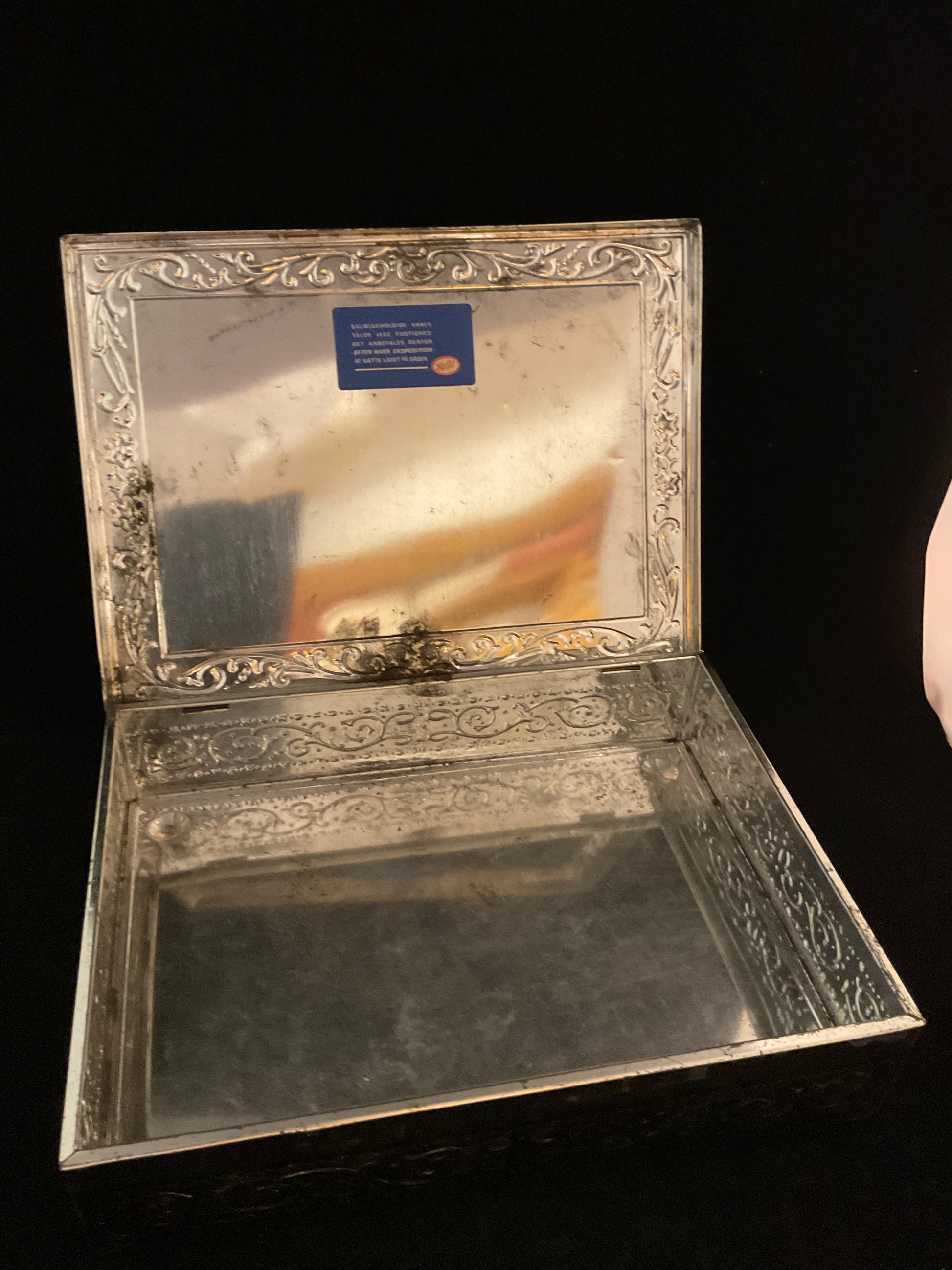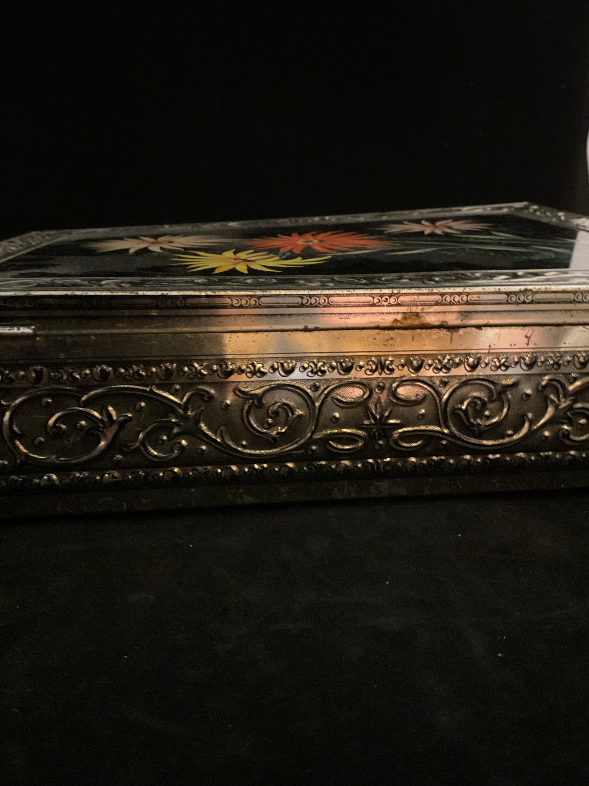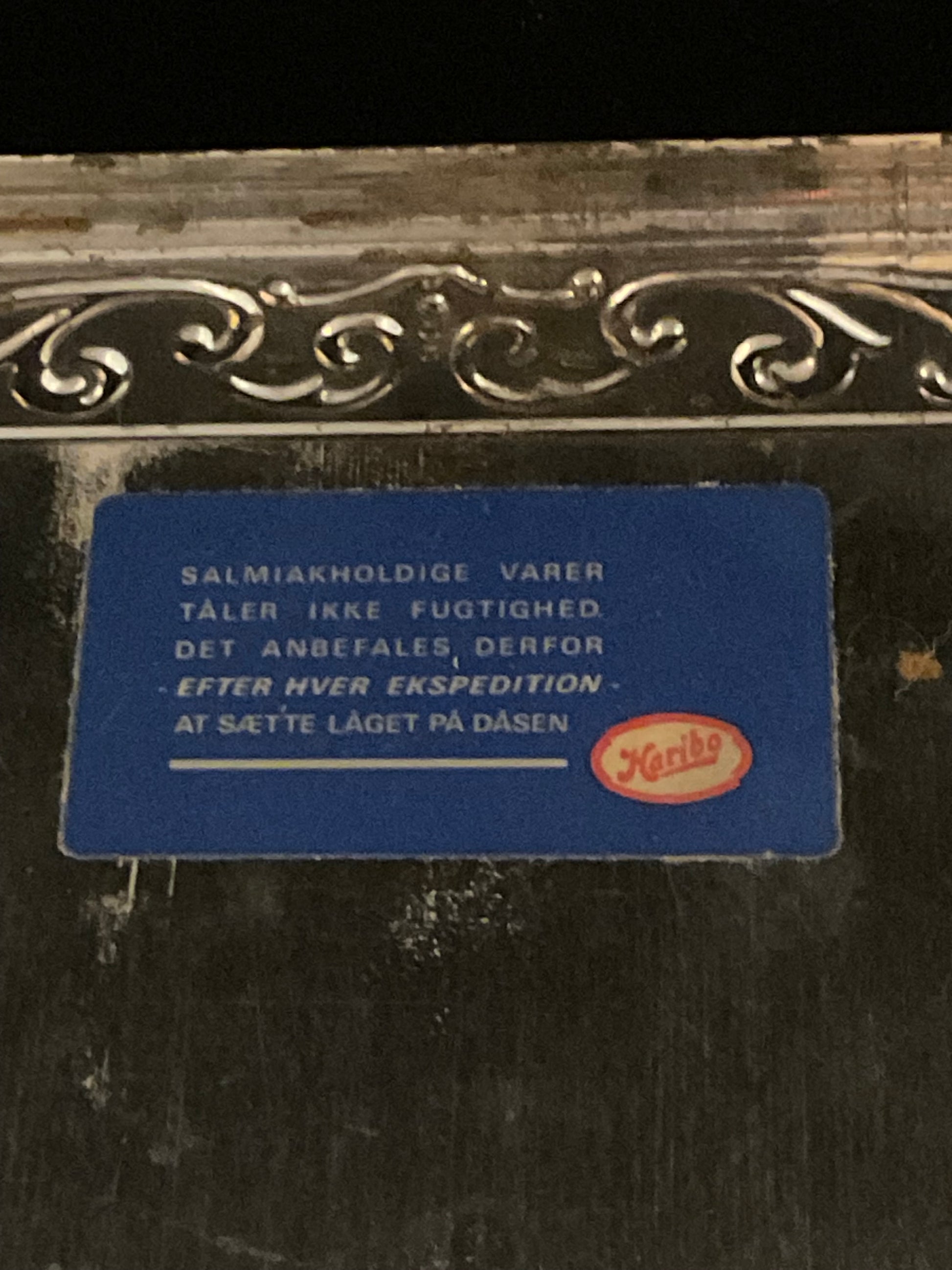 Smuk Haribo-blikdåse med blomstermotiv og præget sølvkant. Brugt som butiksdåse til opbevaring af salmiakslik, hvilket fremgår af etiketten indvendigt.