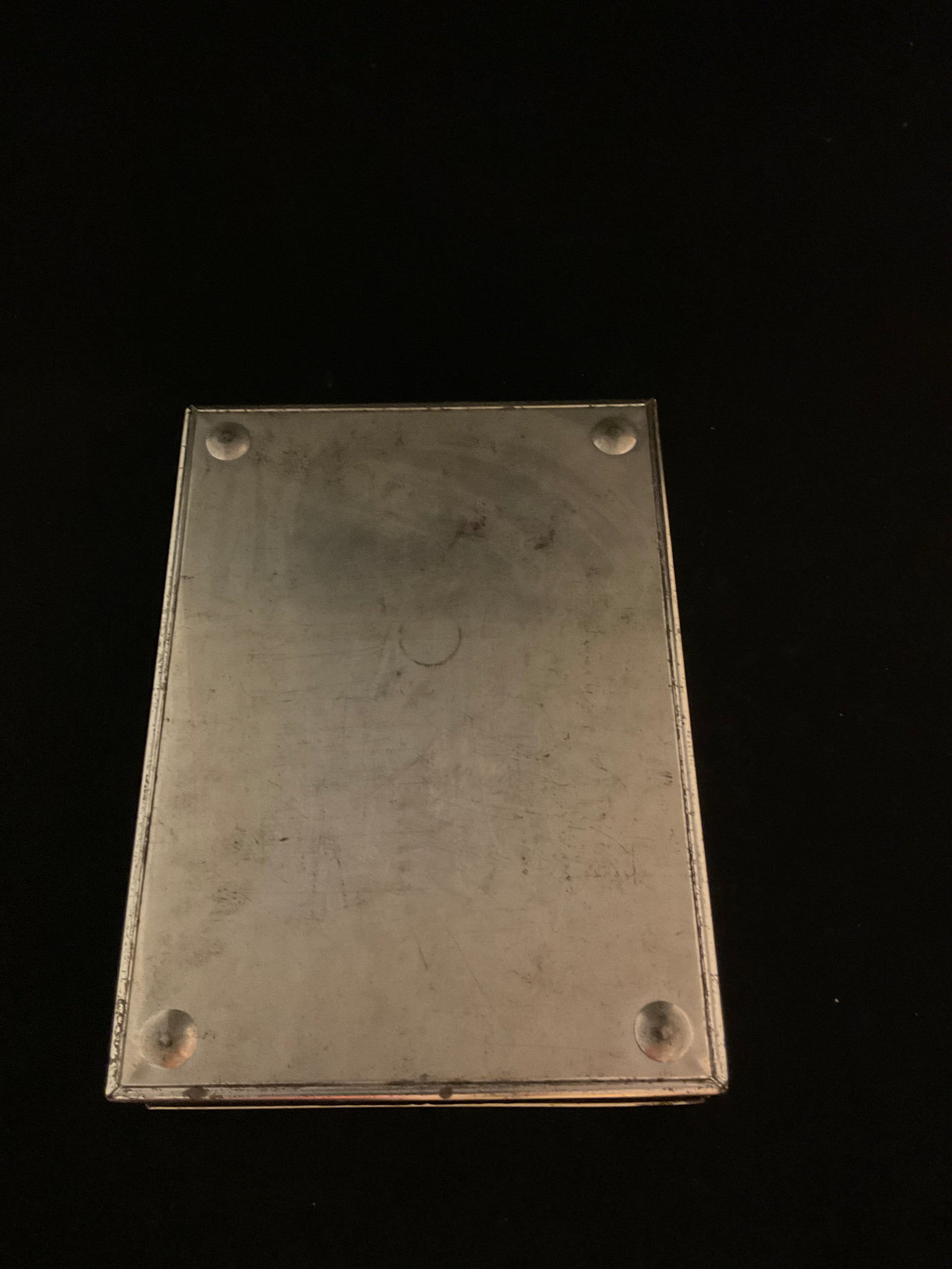 Standen er overordnet pæn, men med forventeligt slid og med rust midt på indersiden mellem hængslerne, se fotos. Etiketten er hel og fin!