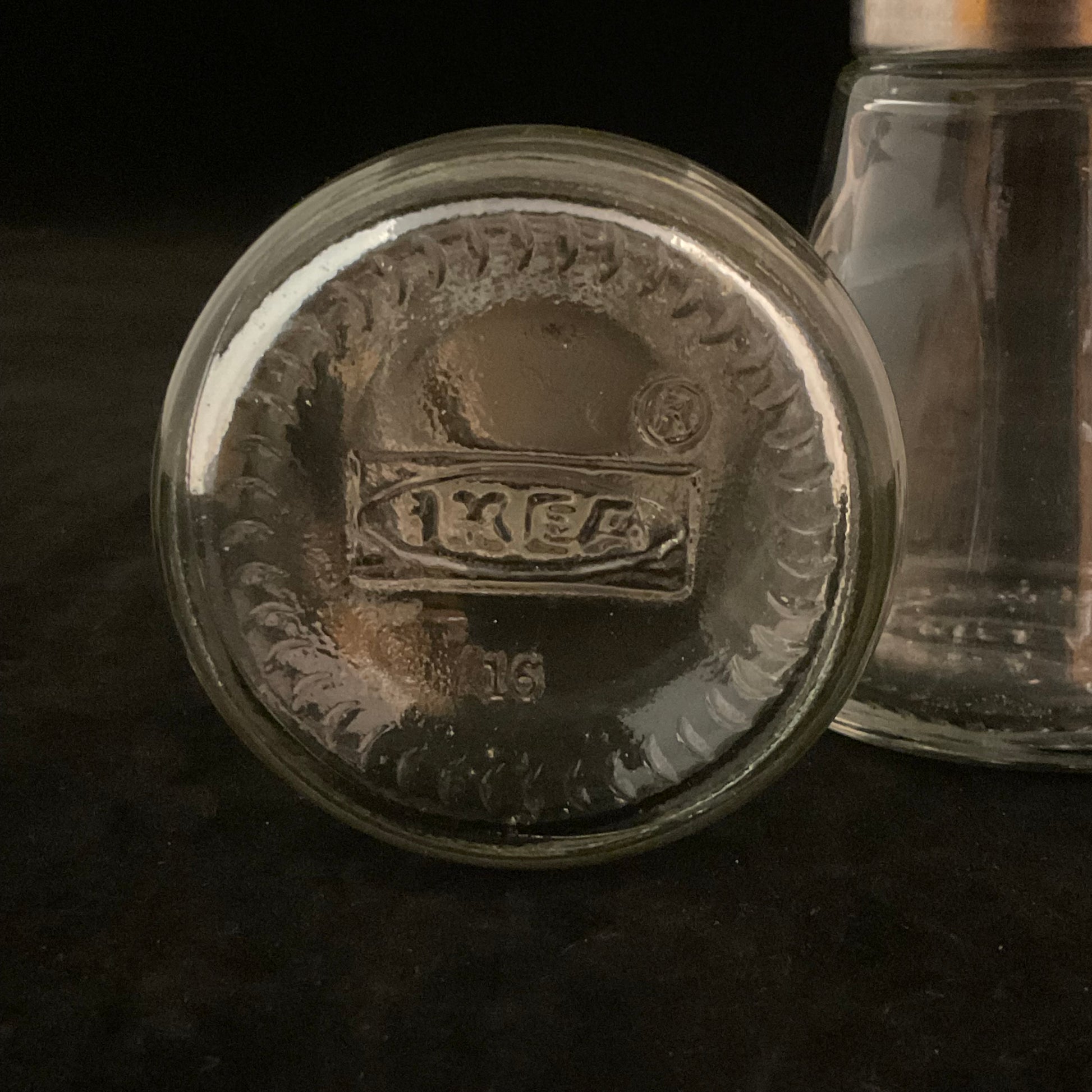 Sæt af IKEA salt- og peberbøsser i klart glas med låg i børstet stål.
