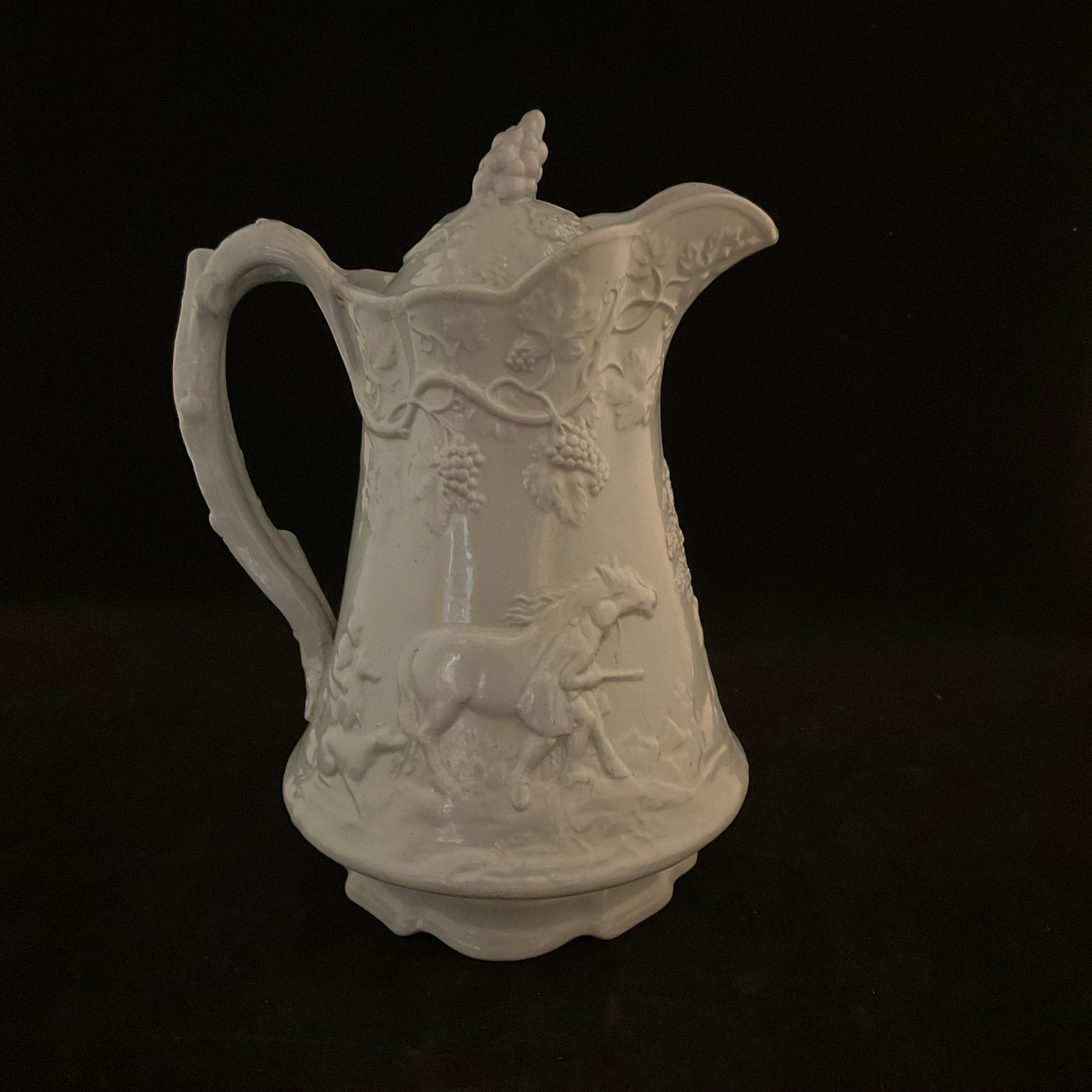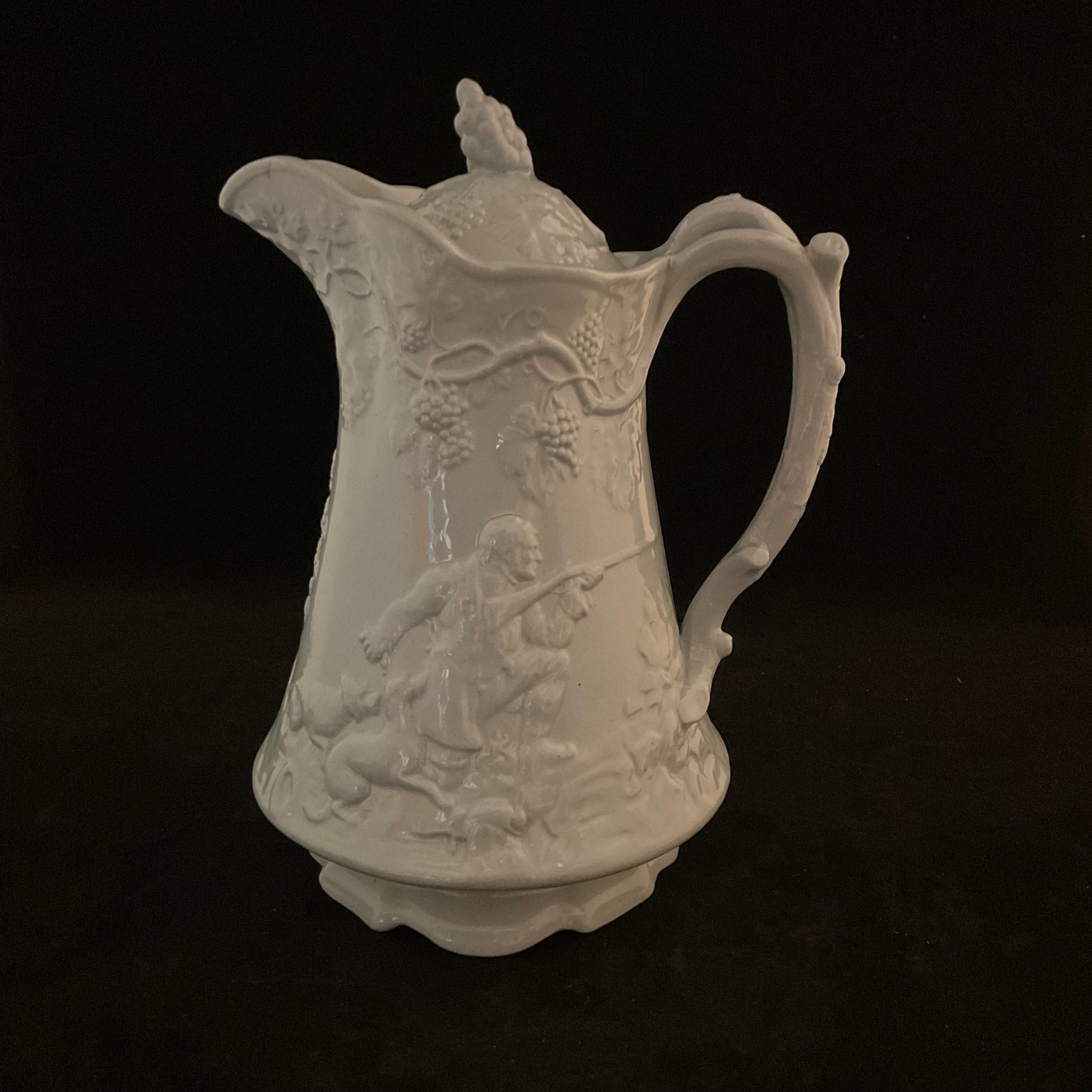 Smuk antik kande i hvid fajance med svagt blålig glasur og rigt modelleret reliefdekoration af vinranker, drueklaser og jagtscene.