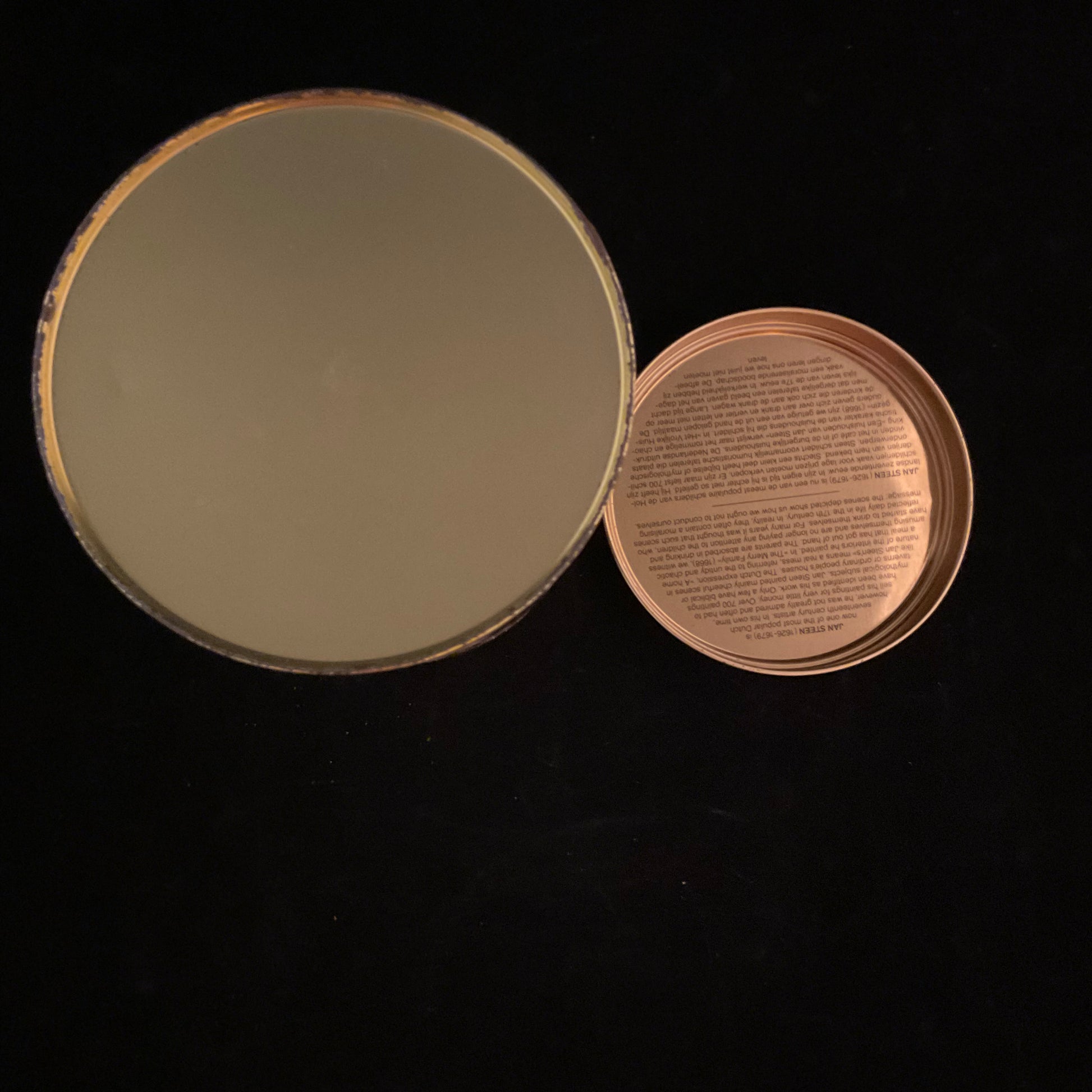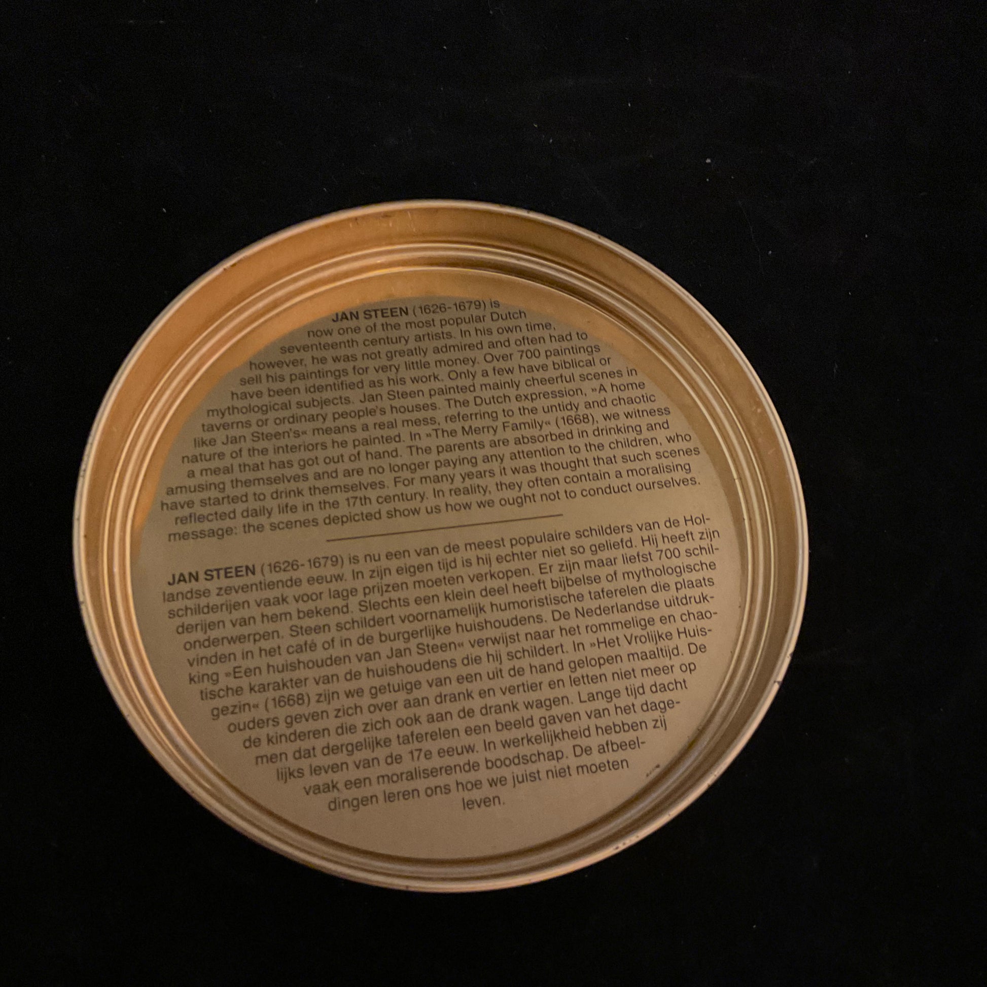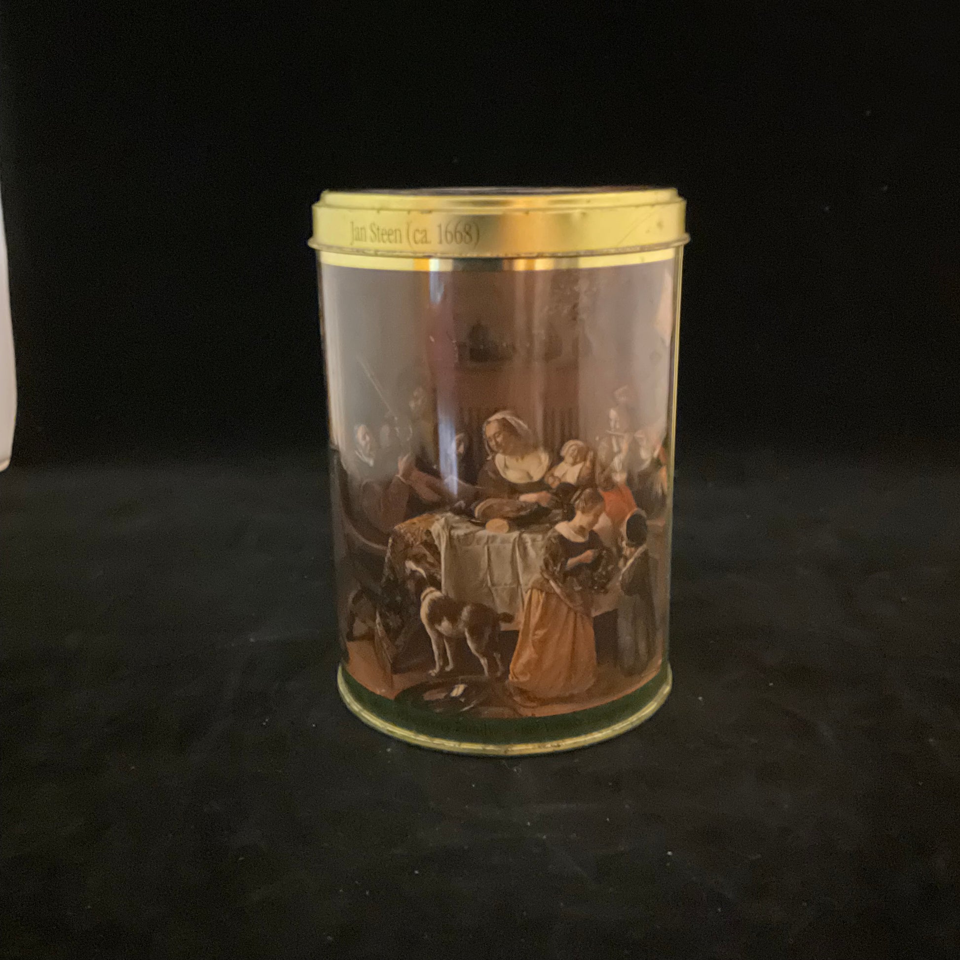 Elegant rund blikdåse fra 1980`erne-1990`erne. Motiv af det berømte maleri The Merry Family af den hollandske kunstner Jan Steen (1626–1679). Gyldne kanter og tekst indvendigt i låget om kunstneren og motivet.
