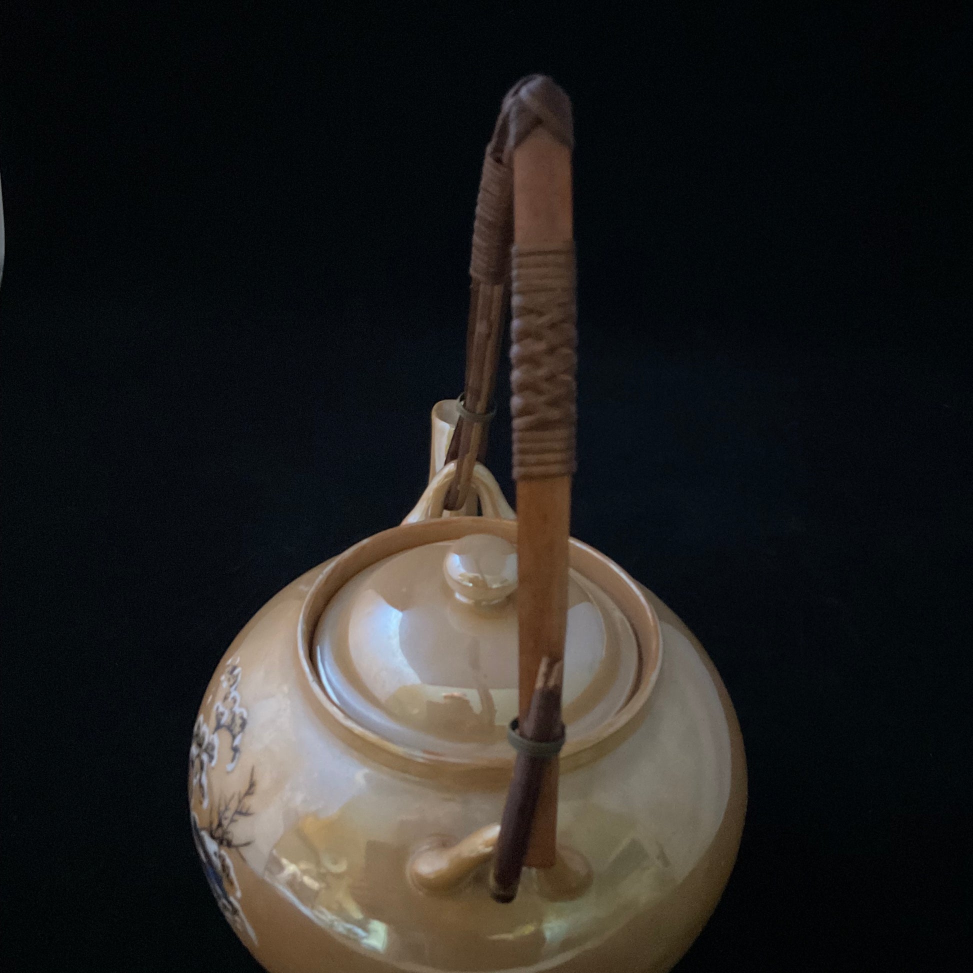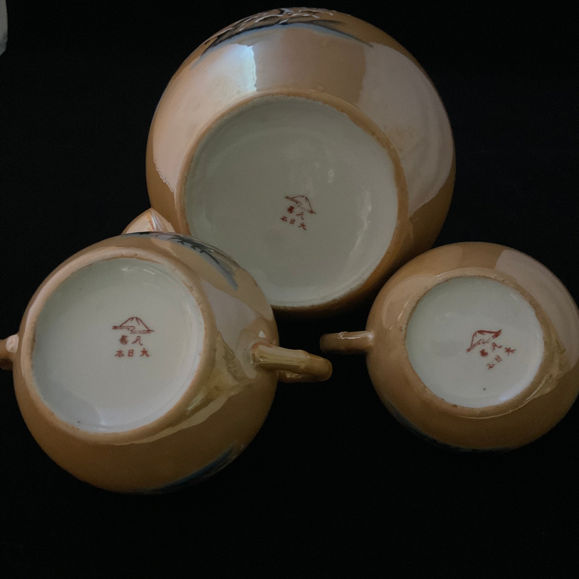 Japansk te-sæt bestående af tekande, mælkekande og sukkerskål. Dekoreret med motiver af Fujii-bjerget, perlemoreffekt i glasuren og hanke udformet som bambus.