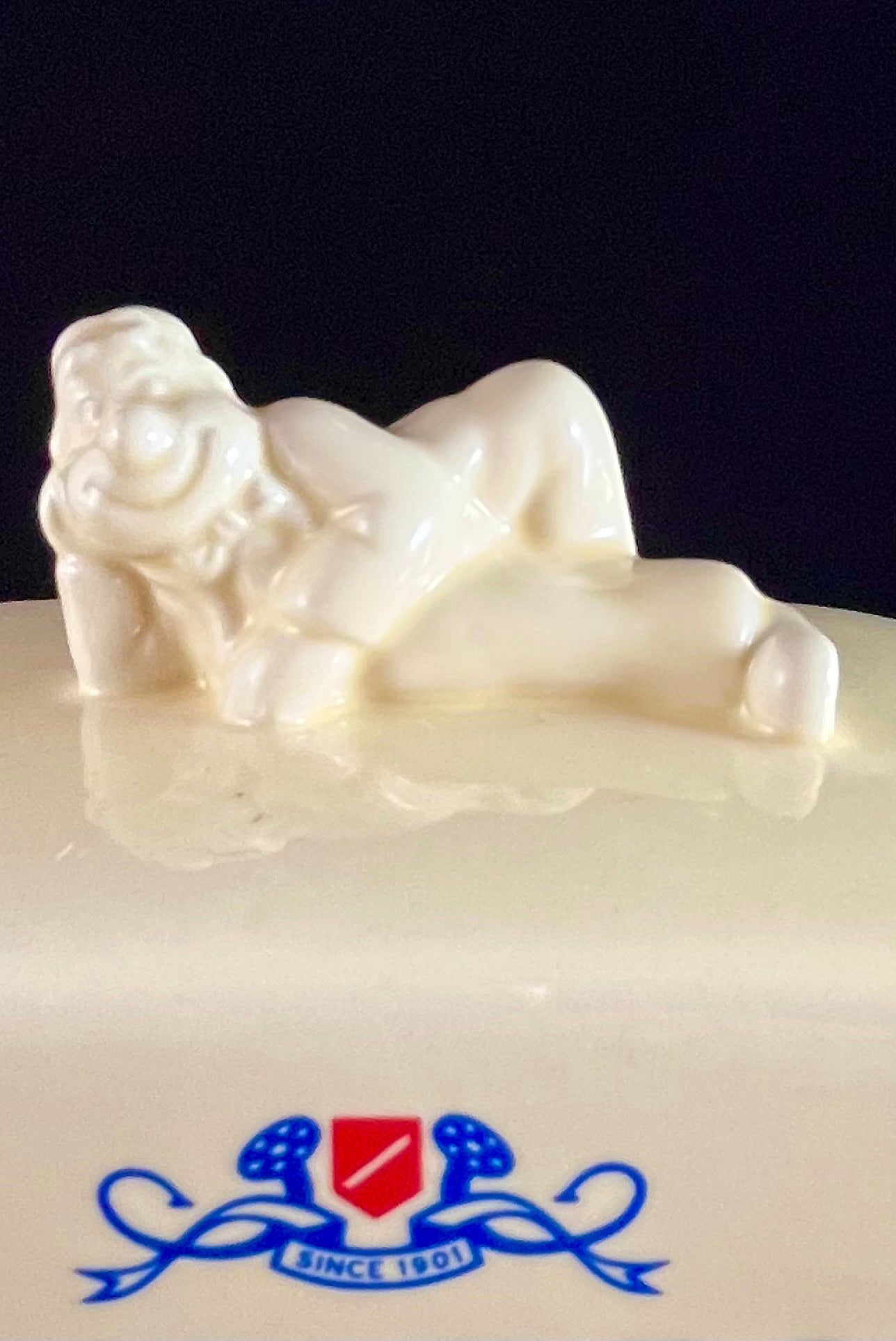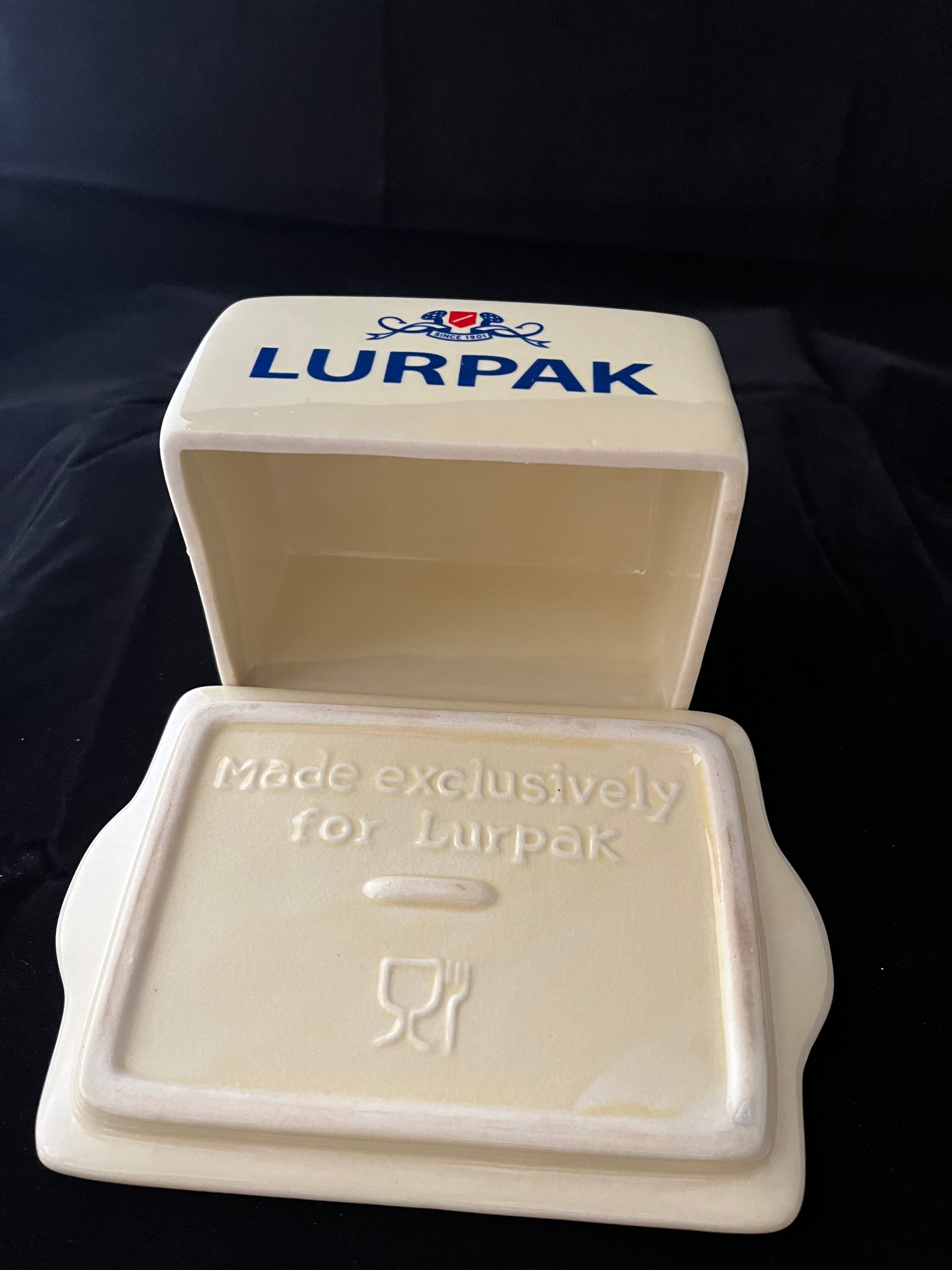 Vintage Lurpak smørboks i keramik, som tydeligt viser Lurpak-logoet og den ikoniske figur Douglas. Fremstillet til det engelske marked.
