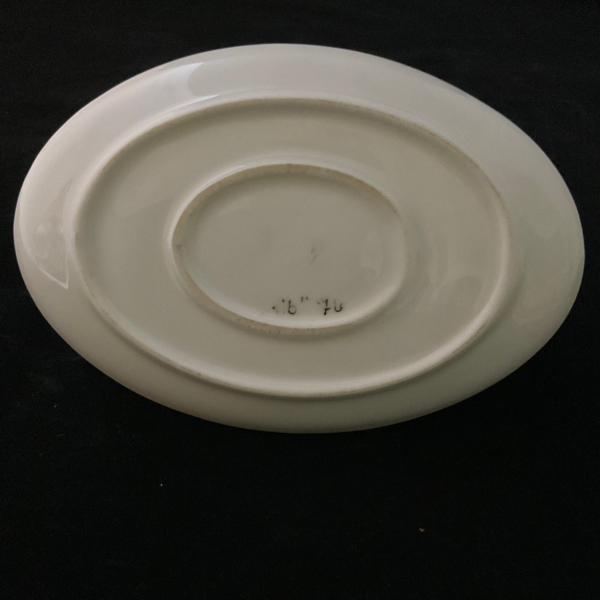 Miniature suppeterrin, håndmalet/hjemmemalet i 1976 med lyserøde blomster.