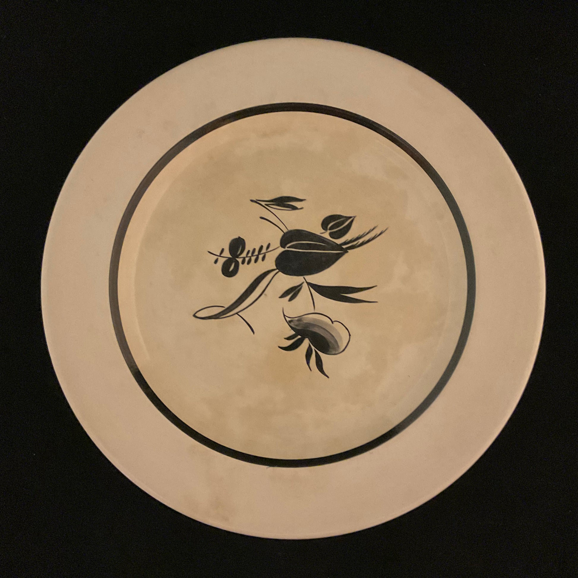 Cremefarvet bund med enkel, håndmalet dekoration i sort – en stiliseret blomst og frugtgren indrammet af sort cirkel. Klassisk nordisk design med et grafisk udtryk, der passer både til retro og moderne indretning.