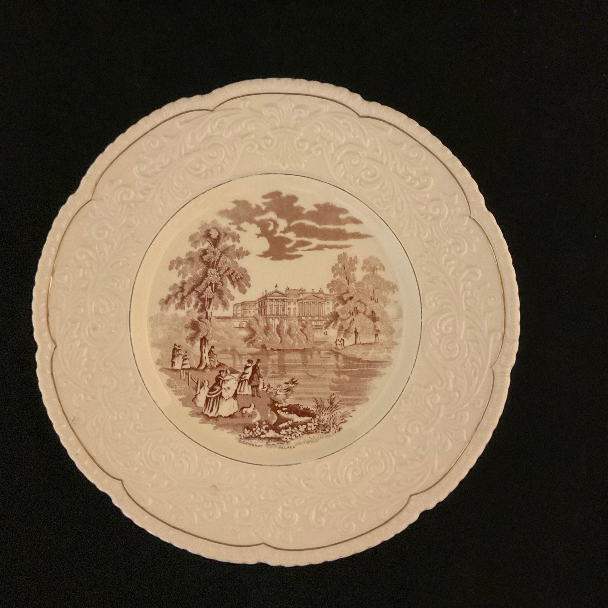 Motivet viser det imponerende Blenheim Palace, udført i brun transfertryk omgivet af en bred, reliefdekoreret kant i cremefarvet fajance.