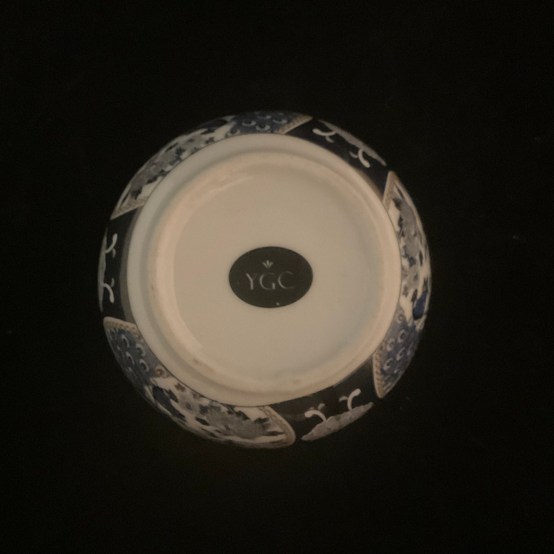 Dekoreret med påfuglemotiv i blå og hvid med fine gulddetaljer. Typisk for japansk eksportporcelæn fra perioden – elegant både til servering og dekoration.4 cm høje og i fin stand!