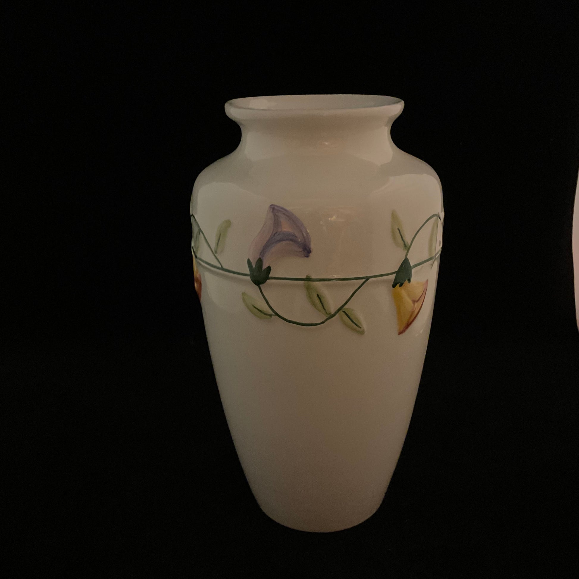 Elegant vintage-vase i glaseret porcelæn, håndmalet med slyngede klokkeblomster i sarte pasteller.