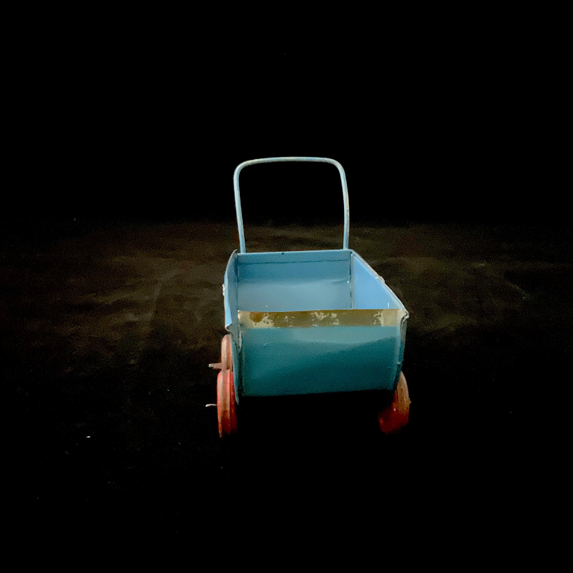 Vintage blik-barne/dukkevogn i klassisk blå med røde hjul og lille dekoration.