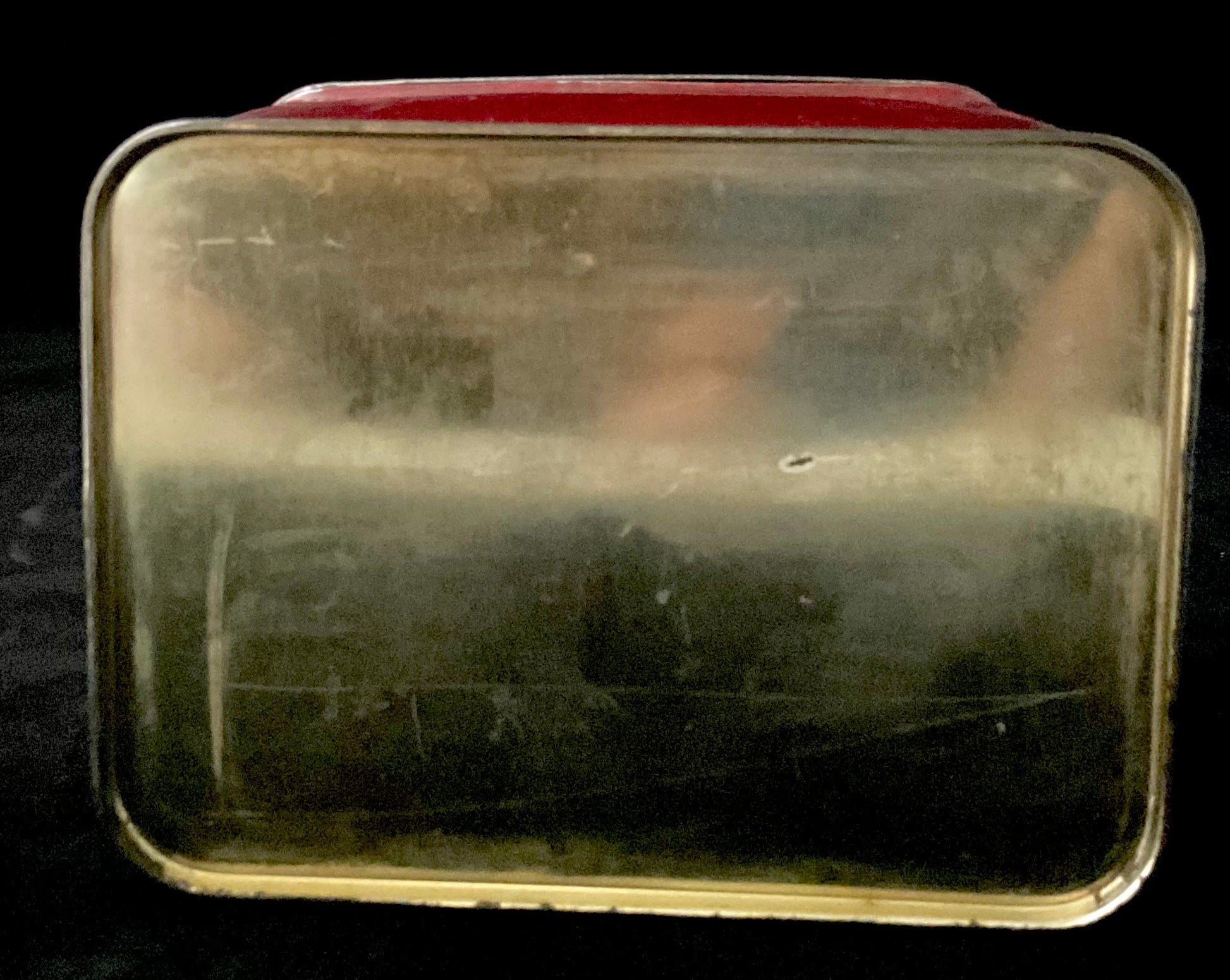 Charmerende rød retroblikdåse med motiv fra H.C. Andersens eventyr Svinedrengen. Fremstillet 1950’erne til 1960’erne. På låget ses prinsessen og svinedrengen i den klassiske eventyrscene, omgivet af dekorativ bort.