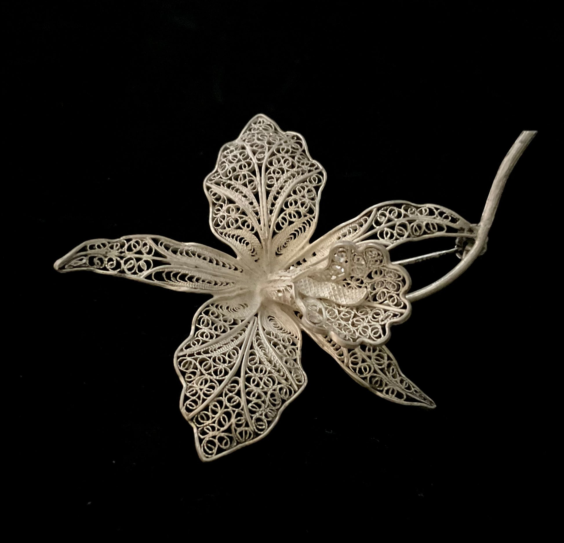 Elegant vintage broche udført i filigranteknik og formet som en orkidéblomst. Brochen er fint håndlavet i sølv (925), og stammer sandsynligvis fra Sydeuropa ca. 1940-1960.