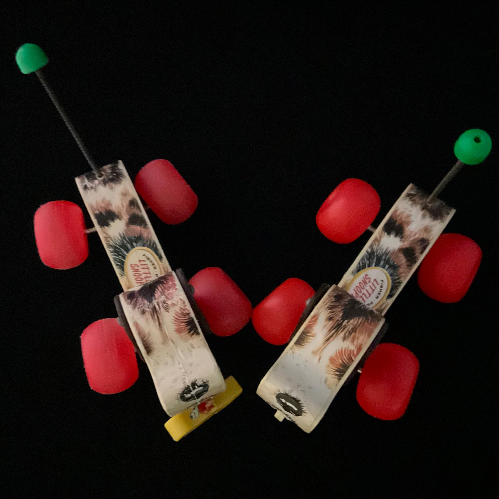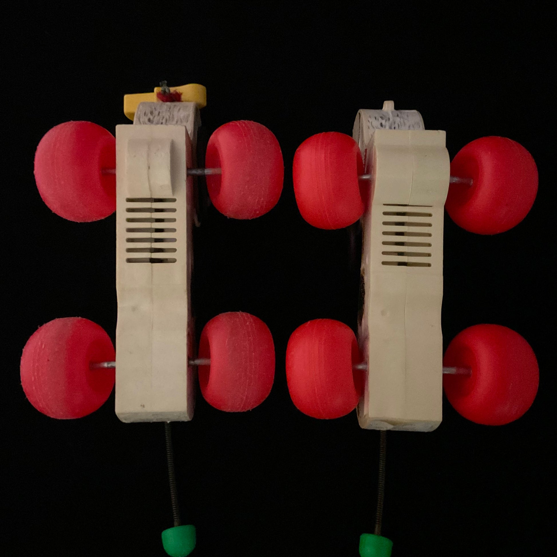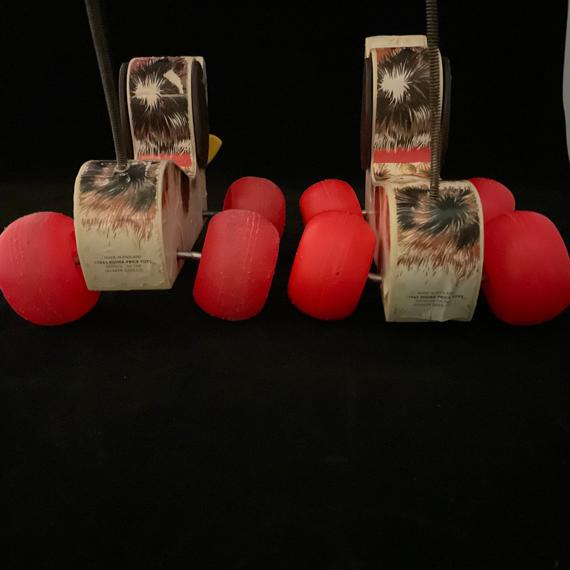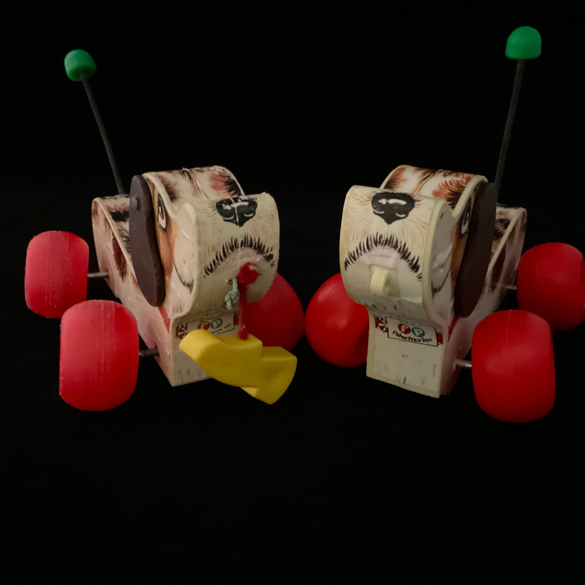 To hunde, fremstillet mens Fisher Price var en del af Quaker Oats. Nok 1965 eller kort tid derefter. De er nummerede med hhv 693 (den med skoen i munden) og 2034. Nr 693 er mere slidt end den anden. De ‘virker’ dog begge to. Sælges samlet.