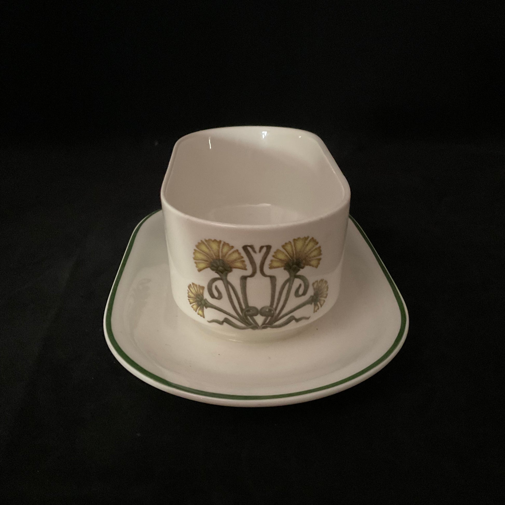 Elegant og smuk sauceskål med integreret fad. Dekoreret med smuk Art Nouveau blomster. Fra serien “Atlantic”