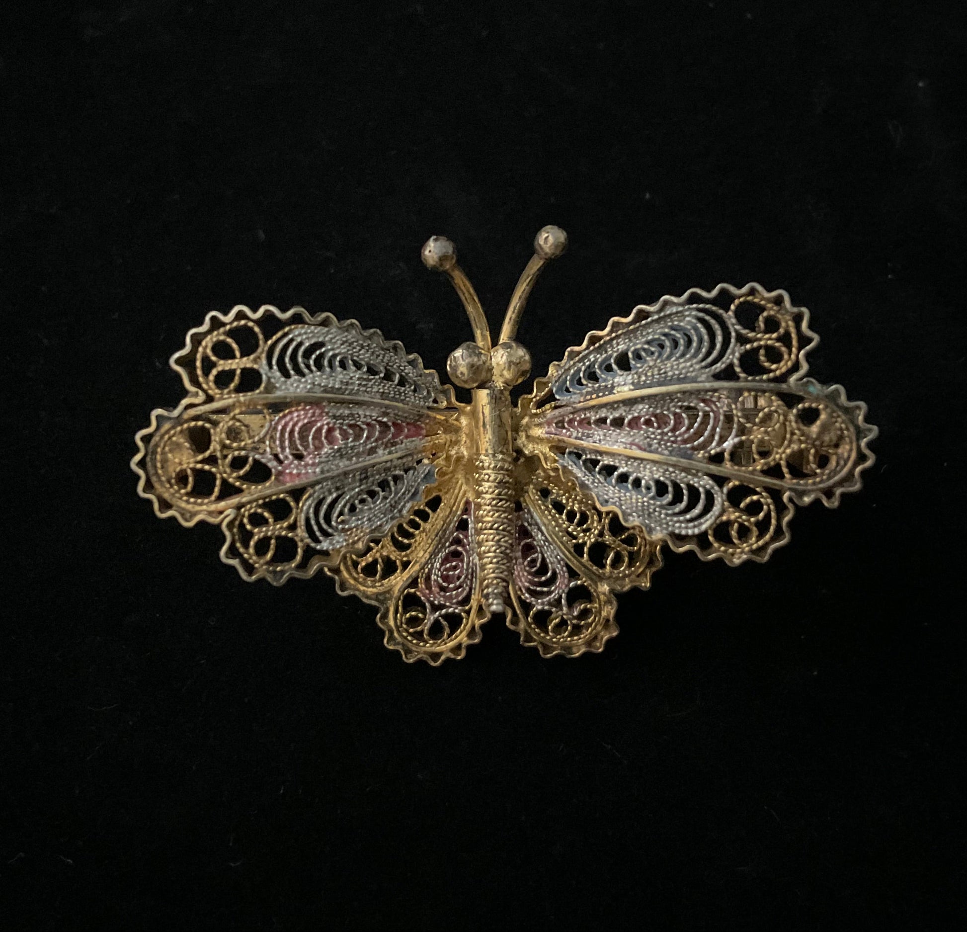 Fin, håndlavet filigran-broche formet som en sommerfugl.Brochen er udført i 800 sølv, forgyldt og med let farvet emalje i vingerne. Stemplet “800” samt italiensk mestermærke.Et smukt eksempel på italiensk filigran-smykkekunst fra midten af 1900-tallet.